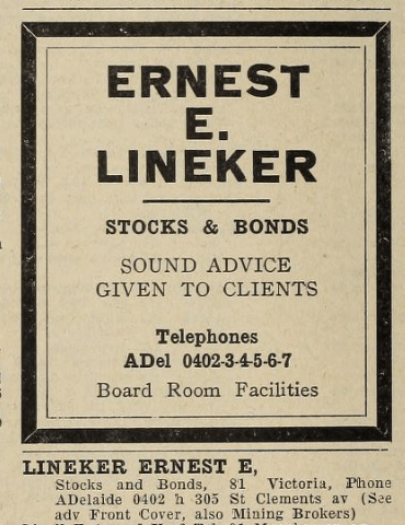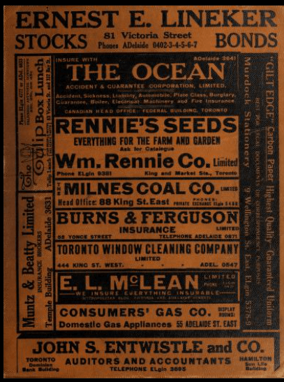 Out of morbid curiosity, I looked Ernest Lineker up in the Toronto city directories. He was indeed a broker in 1928. Not only did he have a listing in that year's directory, he had an advertisement on that page: