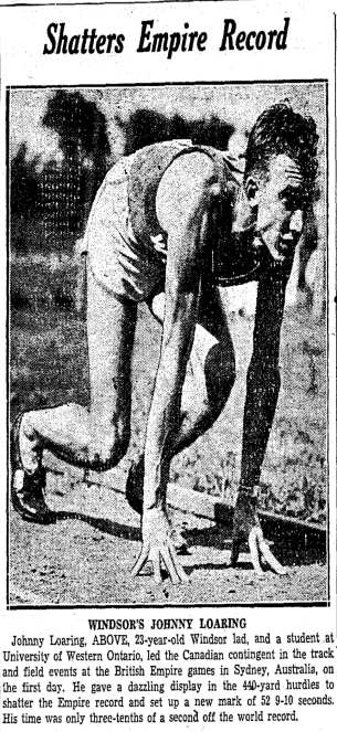 John Loaring (1915-1969) won a silver medal in the 400-metre hurdles in the 1936 Olympic Games in Berlin. He won three gold medals at the 1938 British Empire Games in Sydney, Australia, winning the 440-yard hurdles and as part of the 4x110 yard and 4x440 yard relay teams. He died at a comparatively young age of cancer.