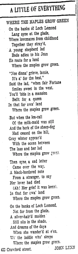 "John Lynn" is a common name, so I don't know for sure what happened to the author of this poem. But the fact that John and John S. were listed in 1931 and only John S. was listed in 1932 suggests, sadly, that John Sr. had left the land where the maples grow green - unless he travelled to Loch Lomond to find his childhood sweetheart.