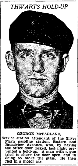 Out of curiosity, I looked George McFarlane up in the Toronto city directories. I discovered that his name was actually George E. MacFarlane; in the 1934 directory, he was listed as working as a service station operator for the Hambleton Company. This company had a service station at 299 Eastern Avenue, which is at the corner of Eastern and Broadview, so I'm pretty sure that this was him.