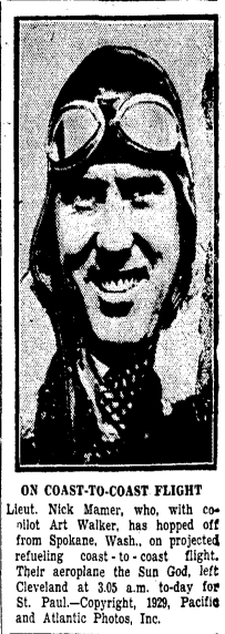 Nick Mamer (1897-1938) and Art Walker, his mechanic, flew continously in the plane Spokane Sun-God for five days starting on August 15, 1929. They flew from Spokane to San Francisco, then to New York City, and then back to Spokane. Refueling was accomplished in mid-air, and the two men got no sleep while performing this endurance flight.
