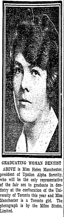 I looked Ms. Manchester up in the Toronto city directories. The 1928 city directory still lists her as a student and living at 70 Edgewood Avenue, but the 1929 directory lists her as Helen J. Manchester, dentist, living at 70 Edgewood and with her practice at 1519 Gerrard East. (The middle initial will become relevant.)