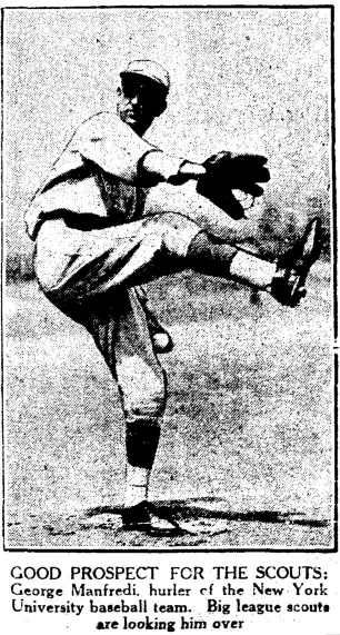 Manfredi is a member of the NYU Hall of Fame - he was inducted in 1979, half a century after he graduated. His claim to fame was that he pitched the first no-hitter in NYU history.