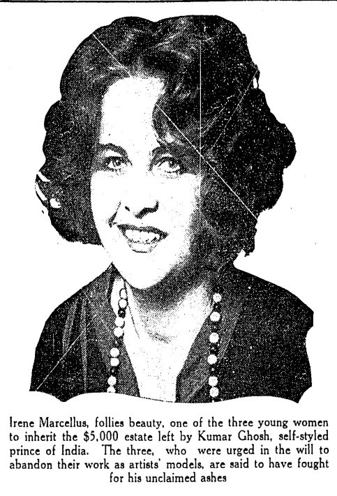 Irene Marcellus, who was apparently considered "the girl with the most beautiful figure in America" at one time, was working as an artist's nude model when she met Sarath Kumar Ghosh, also calling himself Prince Sarath Ghosh of Ghoshpara, who was travelling the United States giving lectures about India. Ghosh befriended Ms. Marcellus and her sister; he apparently fell in love with her, but she refused to marry him.