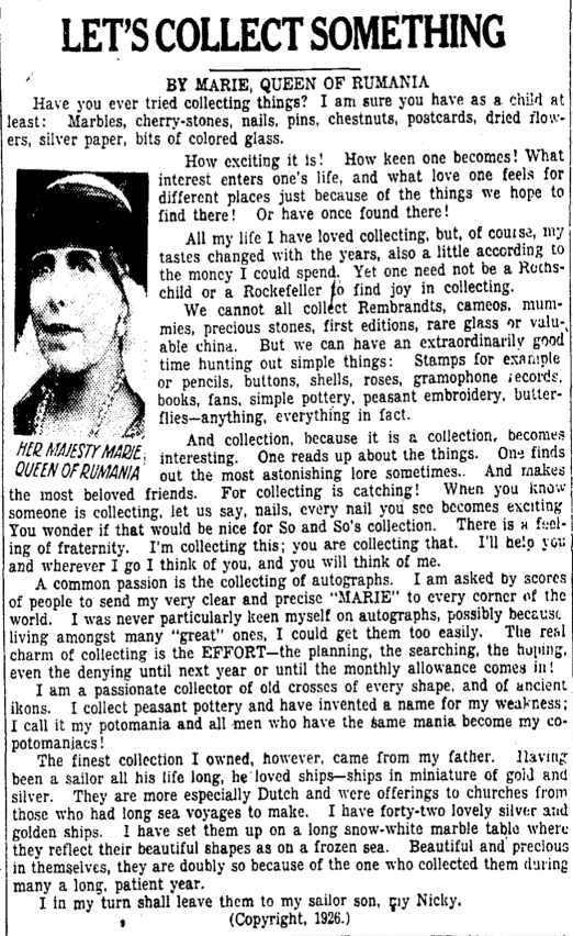 In the 1920s, Marie, Queen of Rumania (1875-1938) was listed as the author of a syndicated newspaper column. I was curious: did she actually write it herself or was it ghostwritten? Her Wikipedia page makes no mention of newspaper writing that I could find, though it did mention that she wrote extensively, producing 34 books and short stories - including a three-volume autobiography, The Story of My Life, and a diary.