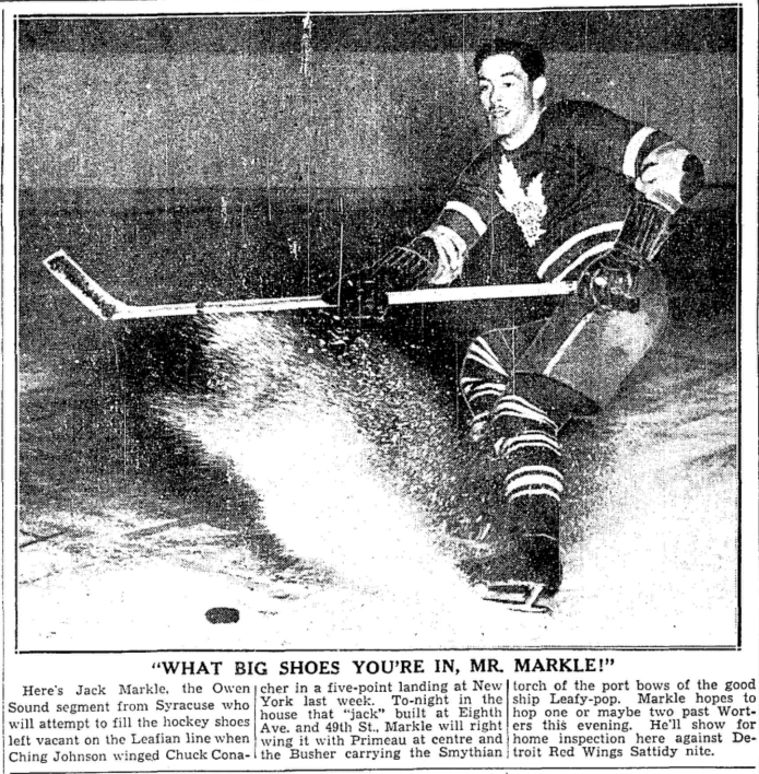 The line that Markle was temporarily joining was the famous Kid Line, featuring Joe Primeau, Charlie Conacher, and Jackson. The three of them had been playing together since 1929 and had led the Leafs to the Stanley Cup in 1932. I don't know for sure whether the injury that sidelined Conacher derailed his career, but he was less effective after the 1935-36 season.