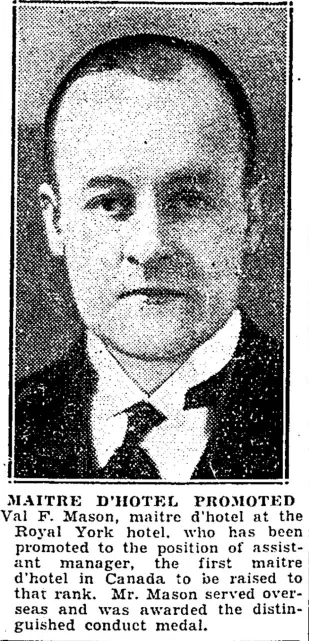 I searched in the Toronto city directories and sure enough: the 1931 Toronto city directory lists Valentine F. Mason as a maitre d'hotel at the Royal York Hotel, and the 1932 directory lists him as assistant manager.