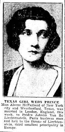The Esoteric Curiosa blog has a collection of articles on the marriage of Aleene McFarland and Prince Johannes Baptist Alois Ferdinand Lucas Anton Joseph Maria of Liechtenstein (to use the name that Wikipedia gives him). She was the daughter of a cattle king who might well have owned ranches larger than Liechtenstein; the principality is 162 square kilometres in size.