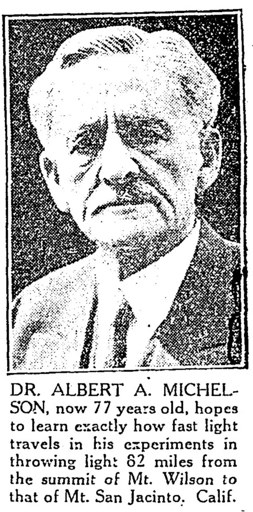 I could not find any information on his attempt to send light from Mount Wilson to Mount San Jacinto. In the early 1920s, he sent light from Mount Wilson to Lookout Mountain, about 22 miles away.