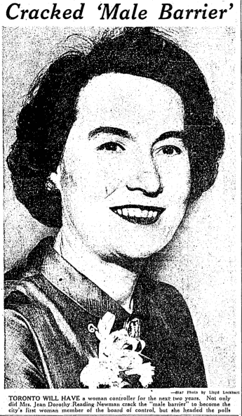 Jean Newman (1905-1971) served only one term on the Toronto Board of Control. In 1958, she ran for mayor, finishing third behind incumbent Nathan Phillips and former mayor Allan Lamport. In 1962, she ran as a Liberal candidate in a by-election and lost; she left politics after that.