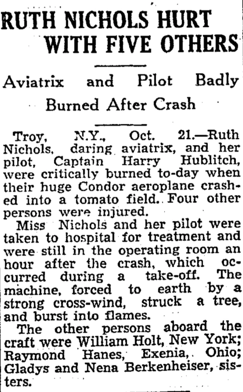 Ruth Rowland Nichols (1901-1960) survived this crash, but suffered a broken left wrist, ankle and nose, contusions, and burns. She was not able to fly again for a year. The pilot did not survive.