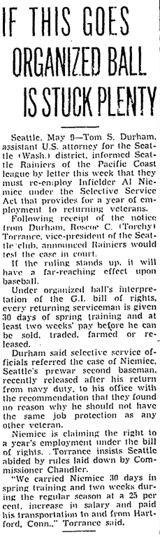 According to Wikipedia, Niemiec won his suit for a year's employment under the GI Bill, which meant that hundreds of major and minor league players were paid despite being cut by their teams immediately after the war. In 1946, he was traded from the Rainiers to the Providence Chiefs, a team in a lower-level league, but he did not play for his new team, and his career was over at the age of 35.