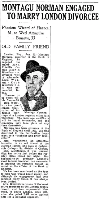 At the time of his May-December romance, Montagu Norman (1871-1950) was the governor of the Bank of England. He held the governor's post from 1920 to 1944. He was sympathetic to Germany: he was a member of the Anglo-German Fellowship, and twice tried to transfer Czechoslovakian gold to Nazi Germany (the British blocked the second transfer).