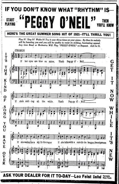 Ms. O'Neil was also the inspiration for a song whose sheet music was for sale in the ad shown above. Naturally, there are a number of versions of "Peggy O'Neil" on YouTube: