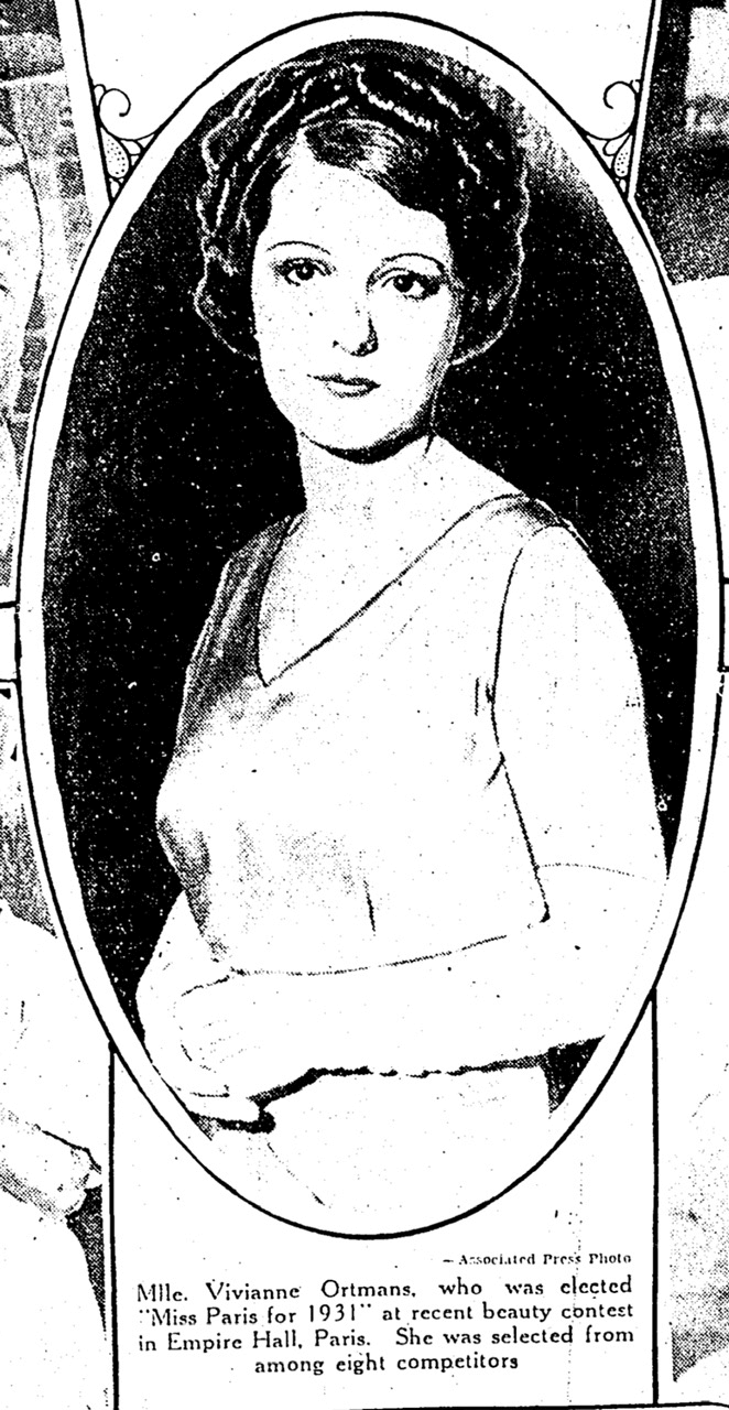Viviane Ortmanns, as she was known at the time of this photograph, appears to have been halfway through a name change - she was born Pauline Ronacher Ortmanns and eventually became Viviane Romance. She made a number of films in France and Italy in the 1930s and 1940s, rejecting a Hollywood contract. She passed away in 1991.