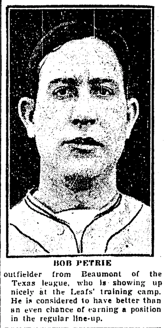Robert Petrie (1904-1969) did become a member of the Maple Leafs in 1930, but it doesn't look like he made the starting lineup: he appeared in 63 of the team's 139 games, sometimes as a pinch-hitter, and batted .259. He played for two International League teams in 1931 - Reading and Jersey City - but then disappeared from organized baseball and from history.