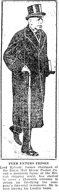 Lord Kylsant's appeals were exhausted at the time of this photo, and he was hauled off to Wormwood Scrubs to serve ten months in the clink. According to his obituary in the TImes, on his release in August 1932 he was greeted as follows: