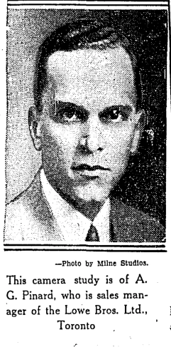 When I looked in the Toronto city directories, I discovered that Arthur G. Pinard's career went on a steady upward path. The 1935 directory listed him as sales manager at Lowe Bros., the 1940 directory listed him as vice-president, and the 1943 directory listed him as president and managing director.
