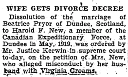 I couldn't find any reference to Harold F. New in the 1933 Toronto city directory, so it appears that the divorcing couple lived out of town. I'm not sure why this divorce merited space in a Toronto newspaper, but I guess anything that filled column space would do.