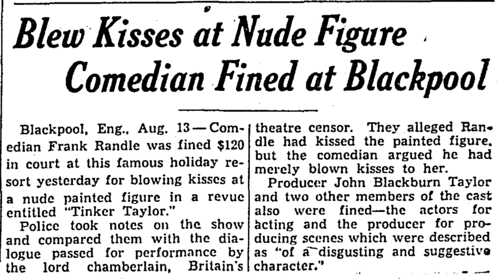 Frank Randle (1901-1957) was a British comedian who appeared in a number of movies in the 1940s. The fine for obscenity described in this article was part of a running feud between Randle and Blackpool chief of police Harry Barnes, who frequently banned him from performing there.