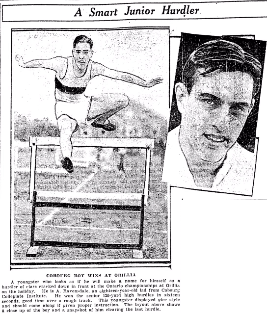 Arthur Ravensdale (1911-1975) continued to compete in the hurdles until the British Empire Games of 1934, despite breaking his hip while playing rugby. A street in his native Cobourg is now named after him.