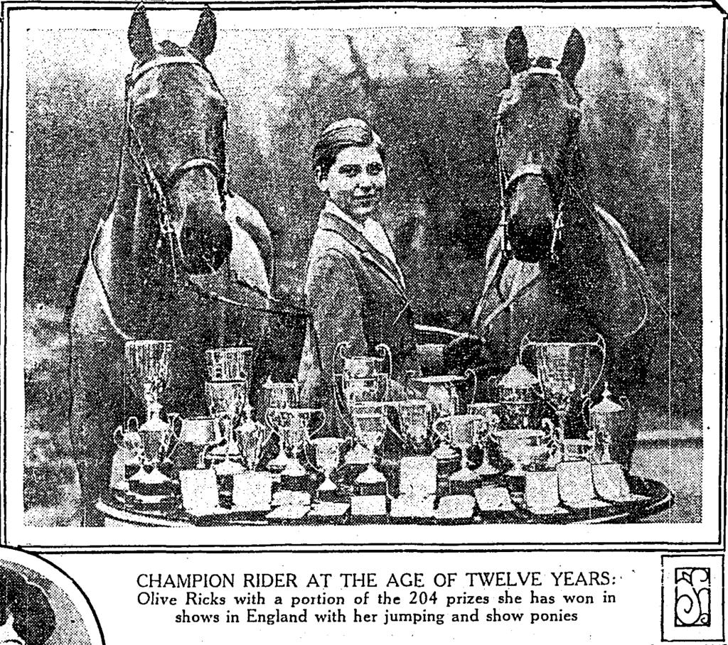 Searches didn't reveal much about Olive Ricks. I found a photograph of her with, presumably, all of her prizes, and a photograph of her having her competitor's number adjusted. I also found out that she eventually became Olive Evans. But I don't know what happened to her; I guess she stopped competing when she got older. I suppose that 204 prizes is enough, really.