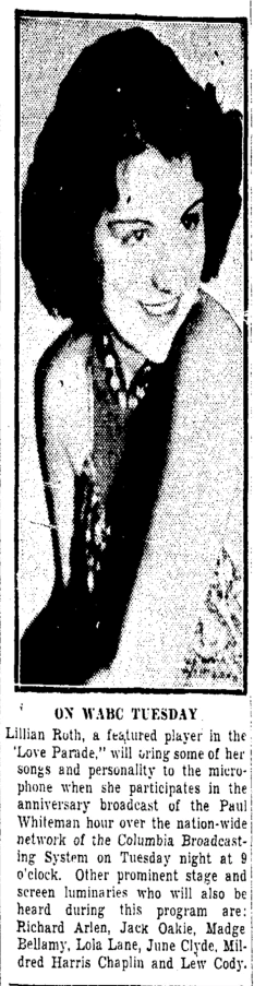 Lillian Roth (1910-1980) started her entertainment career as an early incarnation of the Educational Pictures trademark, being painted as a statue holding a lamp of knowledge (and, according to her autobiography, being molested by the man who painted the statue). She started her Broadway career at the age of 7 and appeared in Frank Fay's Revels in 1923, claiming she was 19. The Love Parade, mentioned in the caption of her photo above, was released in 1929; it starred Maurice Chevalier.