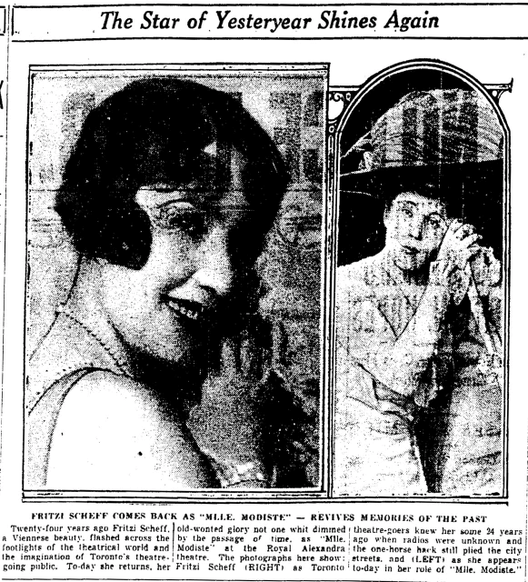 Wikipedia has a brief page on Fritzi Scheff (1879-1954). According to the Internet Broadway Database, she appeared on Broadway in 1929 in Mlle. Modiste, but did not appear there again until 1948. The Internet Movie Database lists her as appearing in a number of television roles as herself near the end of her life.