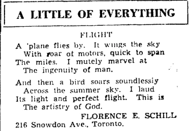 I'm no judge of poetry; all I can say is that this poem didn't really do anything for me. But I was curious, so I traced the poet's name and address in the Toronto city directories. Sure enough, the 1949 directory listed Florence E. Schill; she was working as an editorial assistant at Maclean Hunter, and she was at 216 Snowdon Avenue.