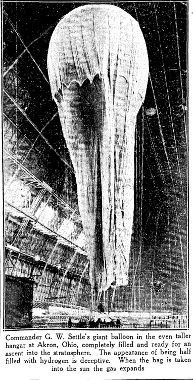 The balloon was named Century of Progress, after the trade show of that name that was held in Chicago in the summer of 1933. And, on the day that this photograph appeared in the newspaper, Thomas G. W. "Tex" Settle (1895-1980) helped set a world altitude record in the balloon, reaching a verified height of 61,237 feet.