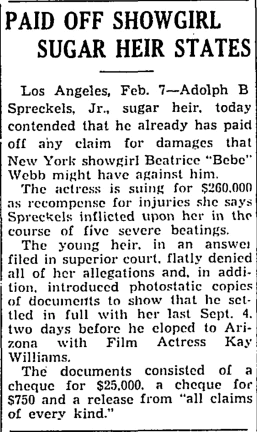 Adolph B. Spreckels Jr. (1911-1961) didn't do anything in his lifetime to merit a Wikipedia page. I did find a page that informed me that he married six times and died two days short of his 50th birthday. He isn't worth writing about - especially since, based on this evidence, he appears to have been a horrible person - but tracing his family yielded some interesting information.