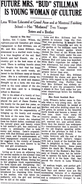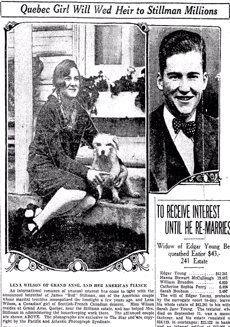 A story that would have captured some interest in 1926 was the marriage of James "Bud" Stillman, heir to a fortune, and a young woman from Quebec named Lena Wilson, who had served as a helper on Mr. Stillman's mother's property. This is partly because Mr. Stillman's parents had recently had notorious marital troubles, but partly because the romance had the trappings of a fairy tale.