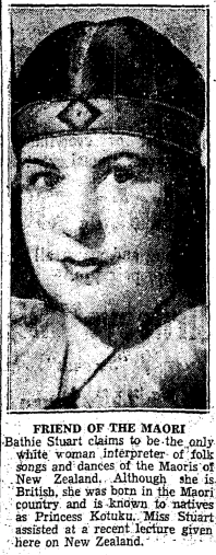 The Encyclopedia of New Zealand website has an entry for Bathia "Bathie" Stuart (1893-1987). After losing her husband to the 1918 influenza pandemic, she became a vaudeville and musical comedy artist in her native New Zealand, creating a show that included Maori women. The women taught her Maori songs and dances; she used this knowledge to become a New Zealand cultural ambassador in California, where she eventually relocated. She also appeared in movies, including The Adventures of Algy (1925).
