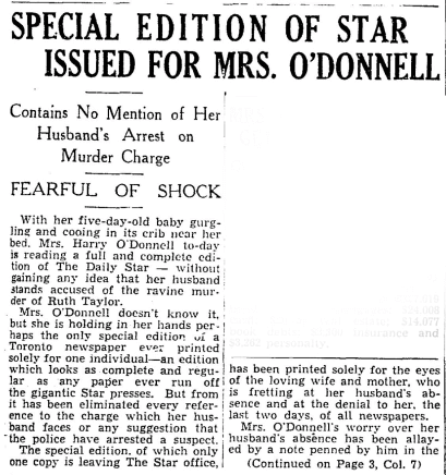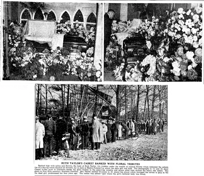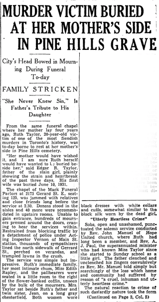 The lead story in this edition of the Toronto Daily Star was the murder of 20-year-old Ruth Taylor. There was an article describing that she had been buried next to her recently deceased mother: