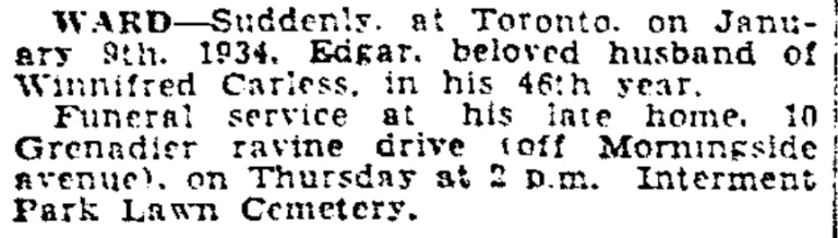 On January 12 1934, Edgar "Barney" Ward was in New York state, working as a mover, away from his wife and family in Toronto. That day, he grabbed a copy of a two-day-old edition of the Toronto Daily Star. Out of habit, he turned to the Deaths section of the newspaper, and was quite startled to discover his own name in it: