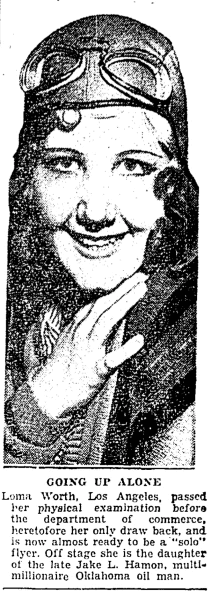 Loma Worth was a stage name sometimes used by Olivebelle Hamon (1909-1987). Ms. Hamon was a child violin prodigy; in 1922, she played her violin while walking up and down the 33 flights of the fire escape of the Wrigley Building in Chicago to raise funds for charity. She started flying lessons at the age of 10, and earned her federal pilot's license after the death of Robert Short, a pilot whom she had planned to marry.