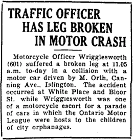 It was not possible to trace M. Orth, the man or woman whose car collided with the unfortunate officer, as Islington was not listed in the Toronto city directory in 1930. I couldn't find an M. Orth in the 1935 directory either.