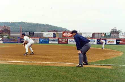 Binghamton, our destination for the evening, is a lovely small city enclosed in a valley. The ballpark is an ambitious new stadium: for years, Binghamton hosted a Class-A team, but has recently moved up to Class AA. This may be a risky venture, as there is virtually nobody in the park. (A threat of rain doesn't help matters much.)