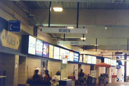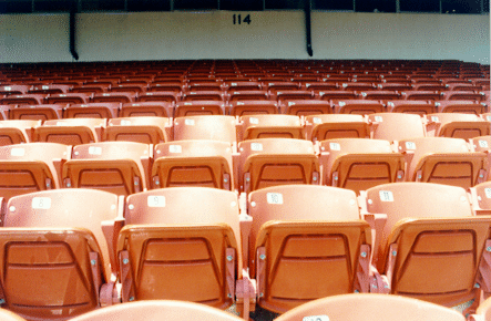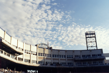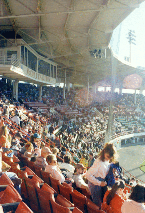 The park itself is located in the middle of an industrial park in the middle of nowhere, and is situated on top of a hill. This last is bad planning: it gets colder up there on cool spring nights. The temperature (shown on the scoreboard) started at 60 degrees, and gradually dropped; when it reached 50, it mysteriously stayed there, despite the fact that we could see our breath; I think this was a PR move. The fans weren't fooled: cries of "Has anybody got any mittens?" and "I'm moving to Brazil!" were the order of the day.