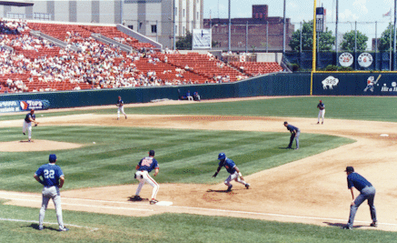 After chowing down on free samples of Stouffer's French Bread Pizza, we arrive at what used to be called Pilot Field but is now (sigh) North AmeriCare Park. (The name "AmeriCare" is an example of what Paul Fussell calls BAD.) Yet another baseball bonus: an earlier rainout means that we get to see two games today. And there's more: our ticket stub entitles us to a second hamburger for the price of one at any Wendy's location in Western New York, except Batavia.