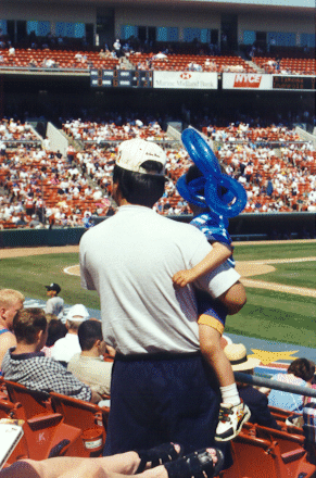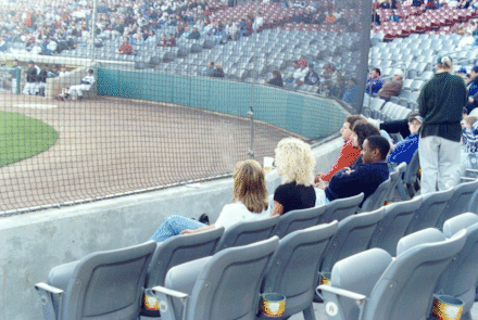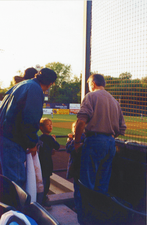 Our seats for the game are really good: front row beside the visitors' dugout. In fact, they are so good that paying attention to the game is not only an enjoyable task but necessary for one's physical health. In the third inning, a foul ball is hit down the first base line heading STRAIGHT FOR ME. If I were a Real Man, I'd've leaned over the railing and fielded the ball barehanded and with aplomb; in the real world, I froze like a deer caught in headlights, and I was fortunate that the ball caromed off the top of the (waist-high) wall and out of harm's way. (I often react this way when confronted with hard-hit projectiles, which is why my front teeth are made of highest-quality plastic.)