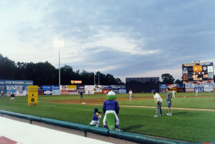 The Norwich Navigators, the home team for tonight's game, are a farm team of the Yankees. (In Connecticut, the w in Norwich is pronounced, not silent.) It may be a coincidence, but Norwich was the place where management seemed most determined to extract as many dollars as possible from the paying customers. The plastic seats were closer together than at other parks; this made watching a game a less pleasant experience for tall or big people. In addition, the scorecard was sold separately, as opposed to being included in the souvenir program.