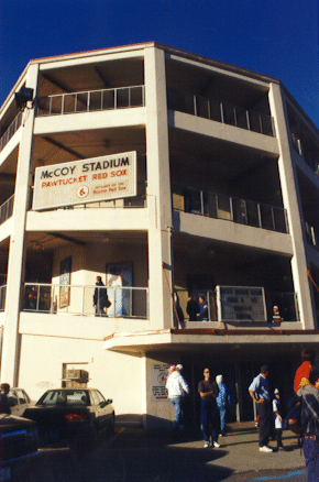 McCoy Stadium, in Pawtucket, is the first old-time stadium we've been to. It was built in 1942, and has all of the classic features of traditional ballparks -- exterior entrance ramps, steeply raked seating, virtually no legroom whatsoever, no crazy promotional stunts, sloooooow infield grass, short dimensions (only 380 feet to center) and lots and lots of atmosphere. It feels like there's more fans in the ballpark than there really are, though that might be because there are a lot of kids in the park.