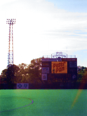 P & C Stadium (named after a local grocery chain) features artificial turf, presumably because the parent Blue Jays also play on turf. It's ugly, as is the rendition of the national anthem by "international recording star" Benny Mardones. Benny is fond of over-emoting; his "air" in "The bombs bursting in air" contains no fewer than seven syllables, and the final "brave" modulates into three separate keys. I choose not to go to the concourse level to get his autograph.